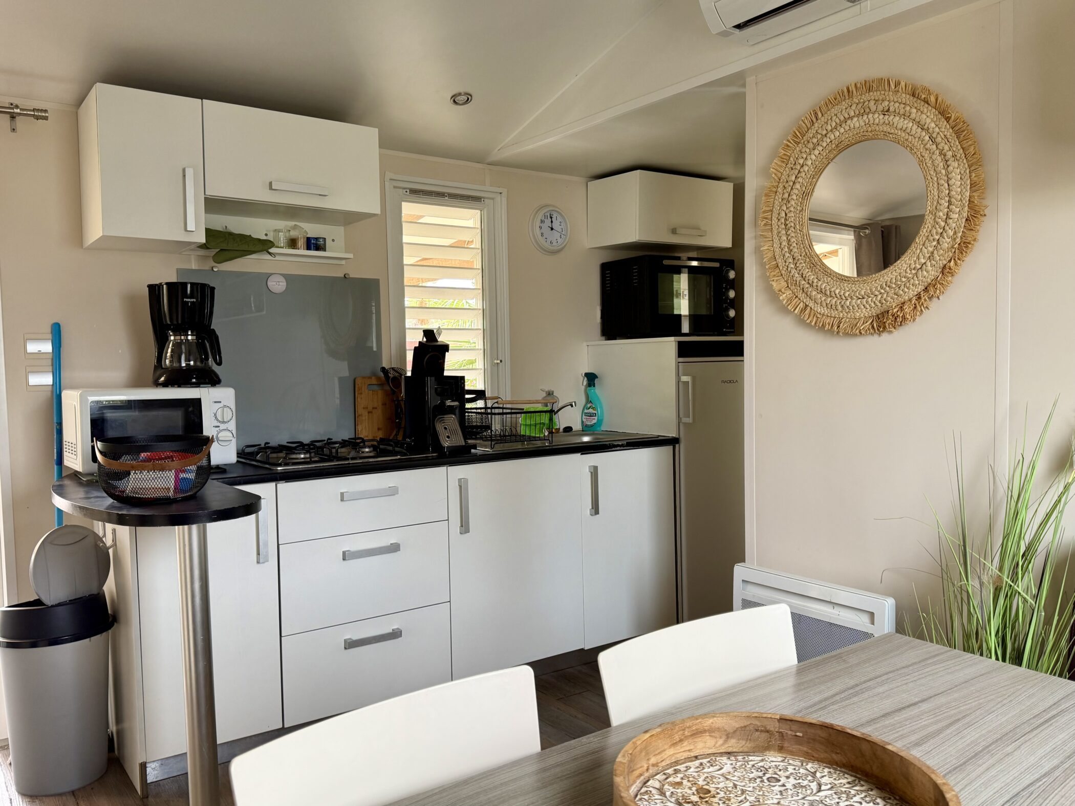 Nestled on a beautiful plot of the campsite close to amenities, this Super Mercure 2 bedrooms mobile home creates a welcoming atmosphere in this family-friendly campsite, where life is good all year round in the Pyrénées-Orientales.